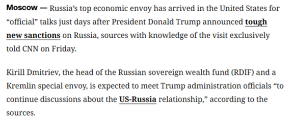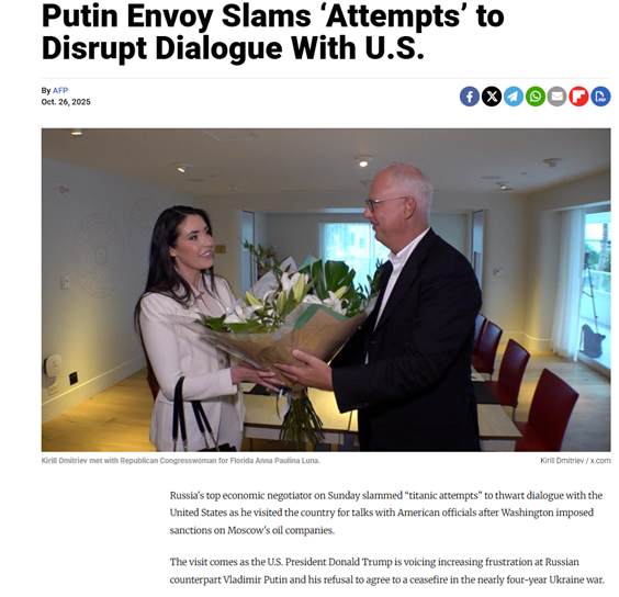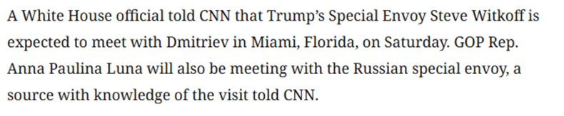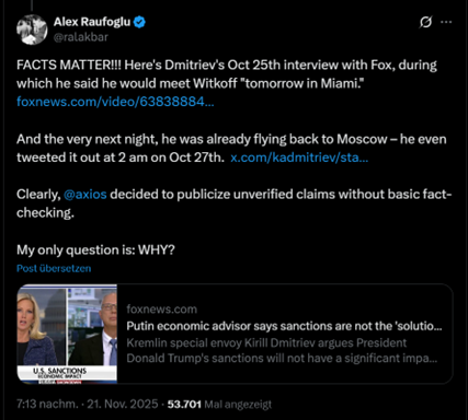 Am 25. Oktober gab Dmitrijew bei Fox News ein Interview, in dem er mitteilte, er würde „morgen“ Witkoff in Miami treffen. Der Tag des Treffen war also der 26. Oktober – ganz offiziell, ziemlich öffentlich, wenig geheim.