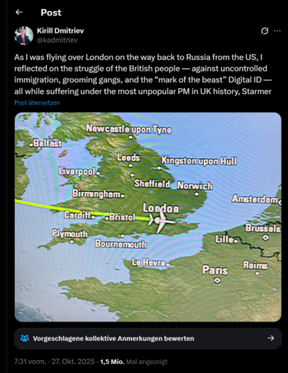 Die drei Tage waren eine Lüge. Am 25. Oktober gab Dmitrijew sein Fox-Interview, in dem er ankündigte, er werde Witkoff „morgen“ treffen – also am 26. Oktober. Und am 27. Oktober morgens Moskauer Zeit twitterte Dmitrijew bereits über seinen Rückflug. Er postete ein Bild, das seine Reiseroute im Flugzeug über London zeigt.