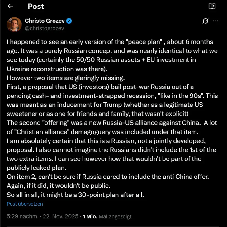 Bevor wir zur offiziellen Geschichte kommen, ein bemerkenswertes Detail: Der Bellingcat-Investigativjournalist Christo Grozev erklärte am 22. November auf X, er habe bereits vor sechs Monaten eine frühe Version des „Friedensplans“ gesehen. Diese Version sei rein russisch gewesen und nahezu identisch mit dem jetzigen 28-Punkte-Plan – inklusive der 50/50-Aufteilung russischer Assets und der EU-Investitionen für den Wiederaufbau der Ukraine.