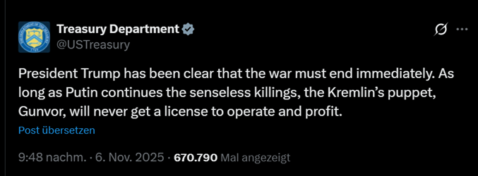 Am 6. November twitterte das Finanzministerium: „Präsident Trump hat klar gemacht, dass der Krieg sofort enden muss. Solange Putin die sinnlosen Tötungen fortsetzt, wird die Marionette des Kremls, Gunvor, niemals eine Lizenz bekommen.“ Gunvor ist ein Schweizer Rohstoffhändler, den Journalist Michael Weiss treffend als Putins „Sparschwein“ bezeichnet.