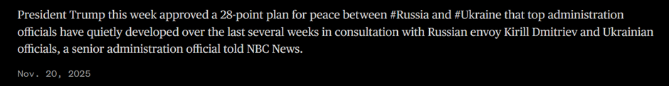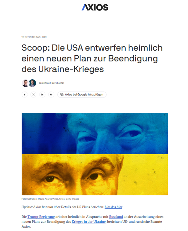 Am 18. November 2025 veröffentlichten die Axios-Journalisten Barak Ravid und Dave Lawler ihren Scoop: Die Trump-Administration habe heimlich in Absprache mit Russland an einem neuen Plan zur Beendigung des Ukraine-Krieges gearbeitet. Heraus kam ein 28-Punkte-Plan, inspiriert vom erfolgreichen Gaza-Deal. Alle Seiten müssten Abstriche machen, aber endlich gebe es einen Rahmen für Frieden.