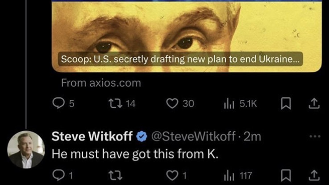 Kurz nach der Veröffentlichung passierte etwas Verräterisches: Steve Witkoff postete auf X einen Tweet, der offenbar nicht für die Öffentlichkeit bestimmt war: „He must have got this from K.“ – „Er muss das von K. bekommen haben.“ Witkoff löschte den Tweet schnell wieder, aber Screenshots waren bereits im Umlauf.