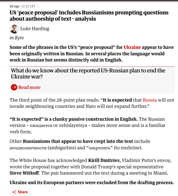 Journalisten des britischen Guardian analysierten die Sprache des Plans und fanden heraus, dass einige Sätze ursprünglich auf Russisch geschrieben worden sein könnten. Punkt 3 etwa lautet: „It is expected that Russia will not invade neighbouring countries“ – eine unbeholfene Passivkonstruktion im Englischen, die im Russischen eine gängige Verbform ist. Auch andere Russizismen fanden sich im Text.