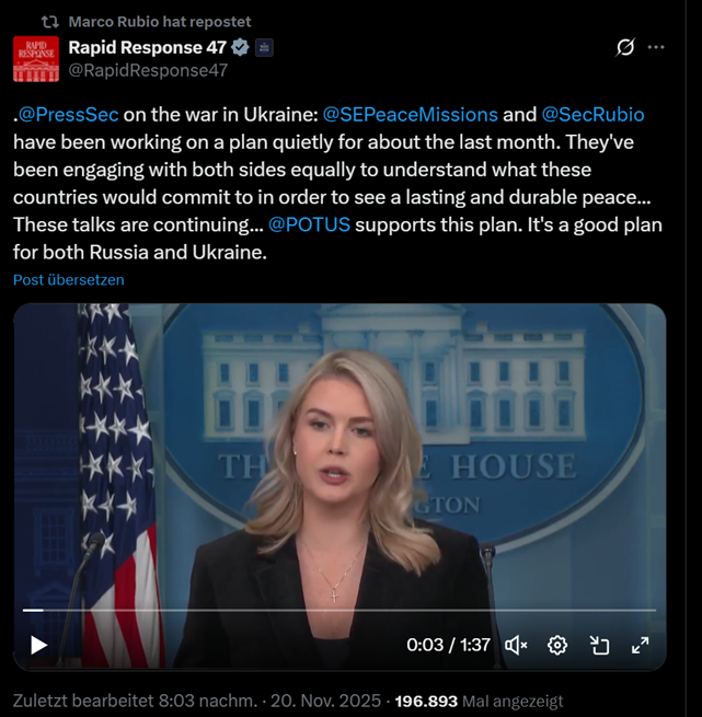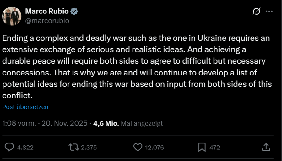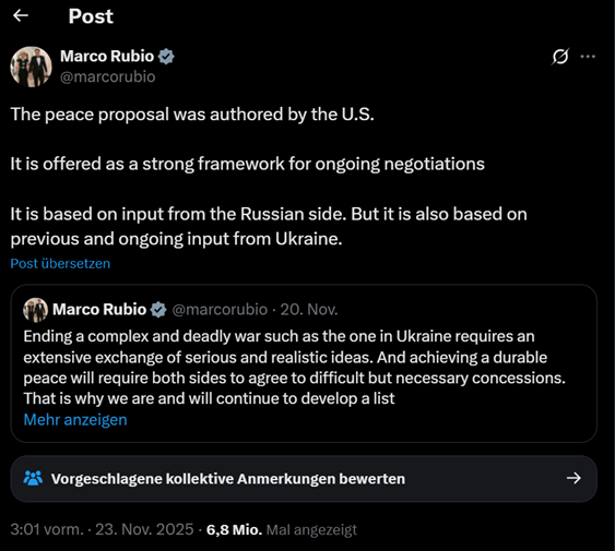 Denn zuerst schien das Außenministerium überrascht. In der Nacht nach der Veröffentlichung des „Friedensplans“ twitterte Rubio: „Einen komplexen und tödlichen Krieg wie den in der Ukraine zu beenden, erfordert einen umfangreichen Austausch ernsthafter und realistischer Ideen. Deshalb entwickeln und werden wir weiterhin eine Liste potenzieller Ideen zur Beendigung dieses Krieges entwickeln.“