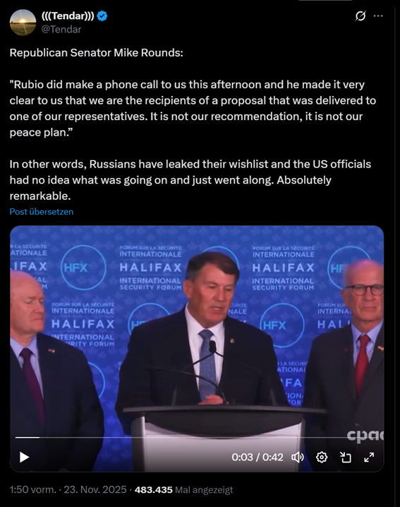 Beim Sicherheitsforum in Halifax hatte der republikanische Senator Mike Rounds erklärt, es handele sich bei dem Plan keineswegs um eine Empfehlung oder den eigenen Friedensvorschlag der USA. Außenminister Rubio habe ihm das persönlich bestätigt. Senator Angus King nannte den Plan unverblümt die „Wunschliste der Russen“. Beide Senatoren betonten, die USA seien lediglich „Empfänger eines Vorschlags“ gewesen.