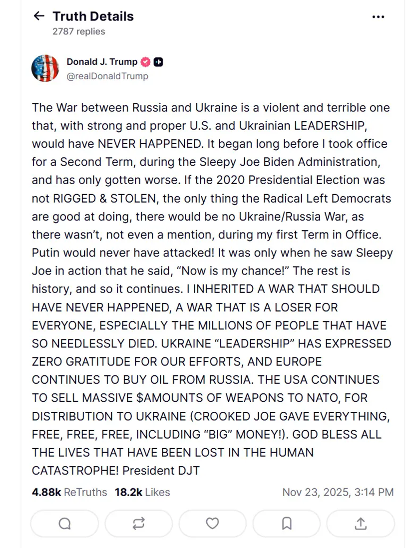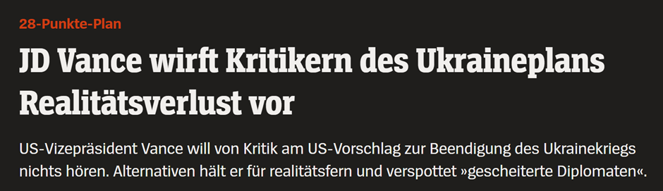 Und am 23. November, mitten in der Debatte um den 28-Punkte-Plan, postete Trump auf TruthSocial: „Ukraine ‘LEADERSHIP’ has expressed ZERO GRATITUDE for our efforts.“ Dieselbe Rhetorik, dieselbe Linie. Das klingt nach Vance.